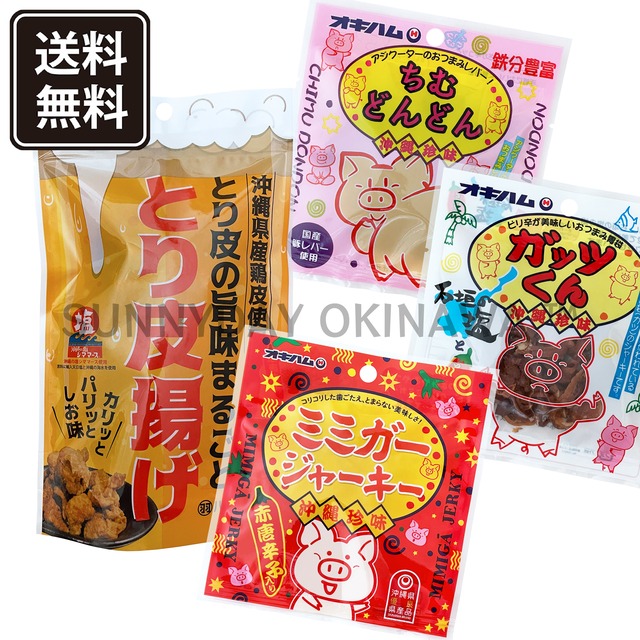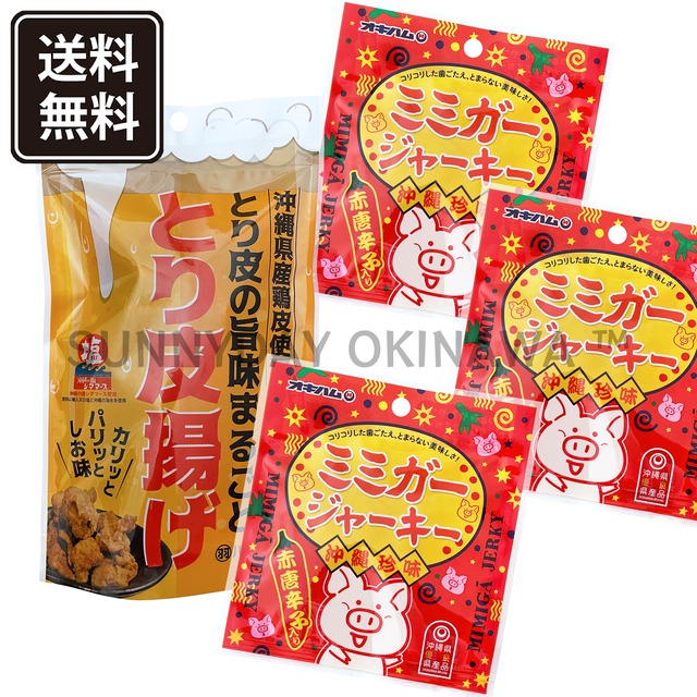 沖縄のおつまみ☆ 食べ切りサイズ(1-2人分) 沖縄県産の鶏皮を使用した「とり皮揚げ」と3種類のミミガージャーキー(小)をセットにしました。 ゆるりと宅飲みにおすすめ。 沖縄のおつまみでお酒の時間をより楽しいものに☆ <とり皮揚げ> ・製造者 : ハネマルフーズ ・内容量 : 50g×1袋 ・賞味期限 : 製造日から90日 ・保存方法 : 直射日光・高温多湿を避けて保存 <ミミガージャーキー> ・製造者 : 沖縄ハム総合食品株式会社 ・内容量 : 9g ・賞味期限 : 製造日から150日 ・保存方法 : 直射日光・高温多湿を避けて保存 <激辛!ミミガージャーキー> ・製造者 : 沖縄ハム総合食品株式会社 ・内容量 : 9g ・賞味期限 : 製造日から150日 ・保存方法 : 直射日光・高温多湿を避けて保存 <ミミガージャーキー ぬちまーす> ・製造者 : 沖縄ハム総合食品株式会社 ・内容量 : 9g ・賞味期限 : 製造日から150日 ・保存方法 : 直射日光・高温多湿を避けて保存 ・商品No : 416