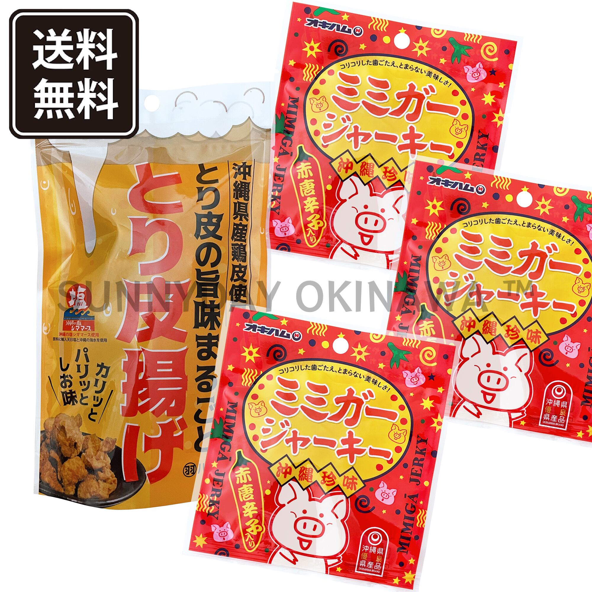 沖縄県産鶏皮の旨味まるごと「とり皮揚げ」と「ミミガージャーキー(小)」をセットにしました。