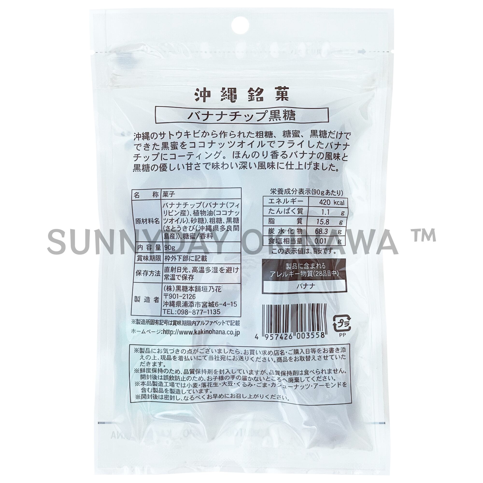 バナナチップ(バナナ(フィリピン産))、植物油(ココナッツオイル、砂糖)、粗糖、黒糖(さとうきび(沖縄県多良間島産))、糖蜜/香料