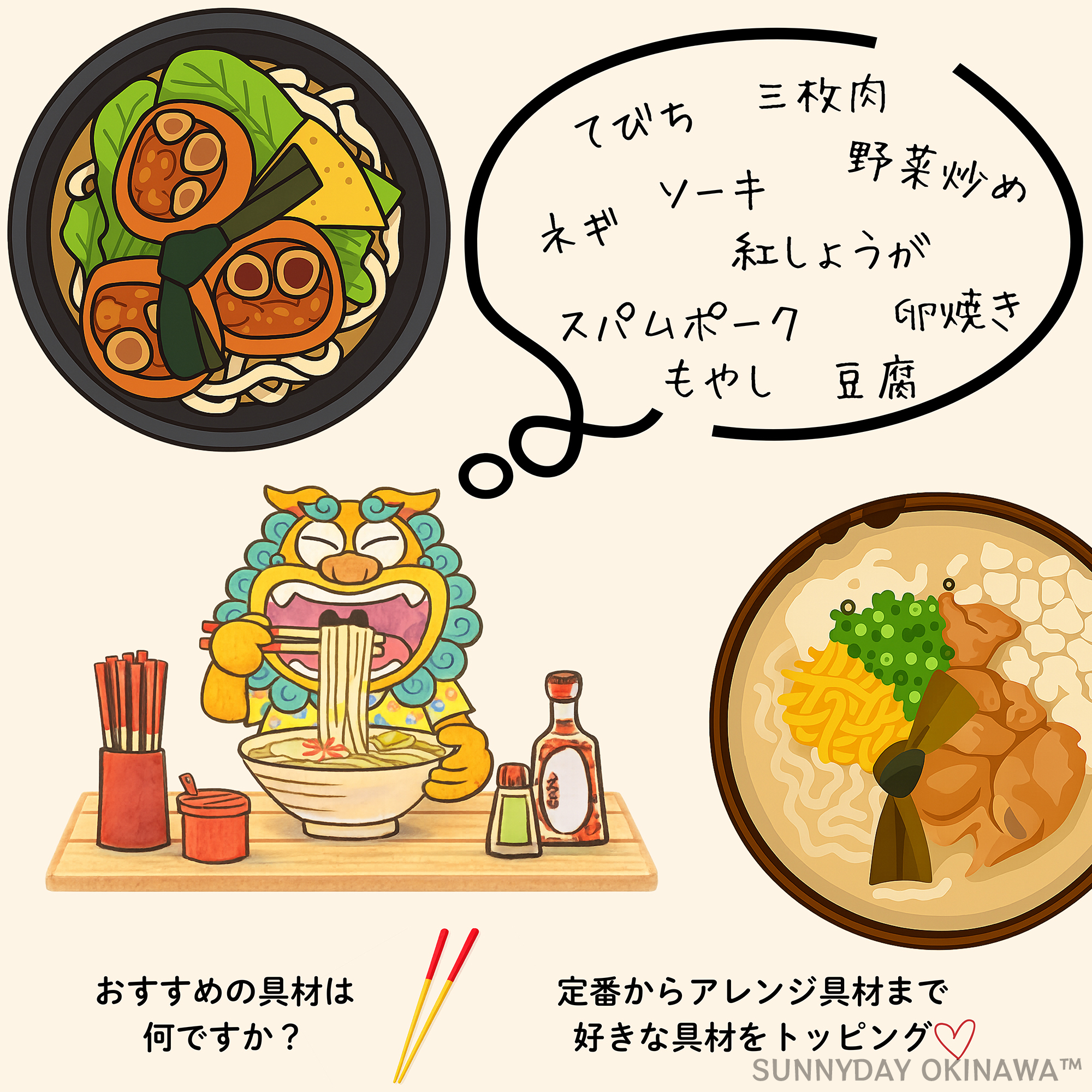 お好きなトッピングで自分だけの「オリジナル沖縄そば」をお楽しみください^_^