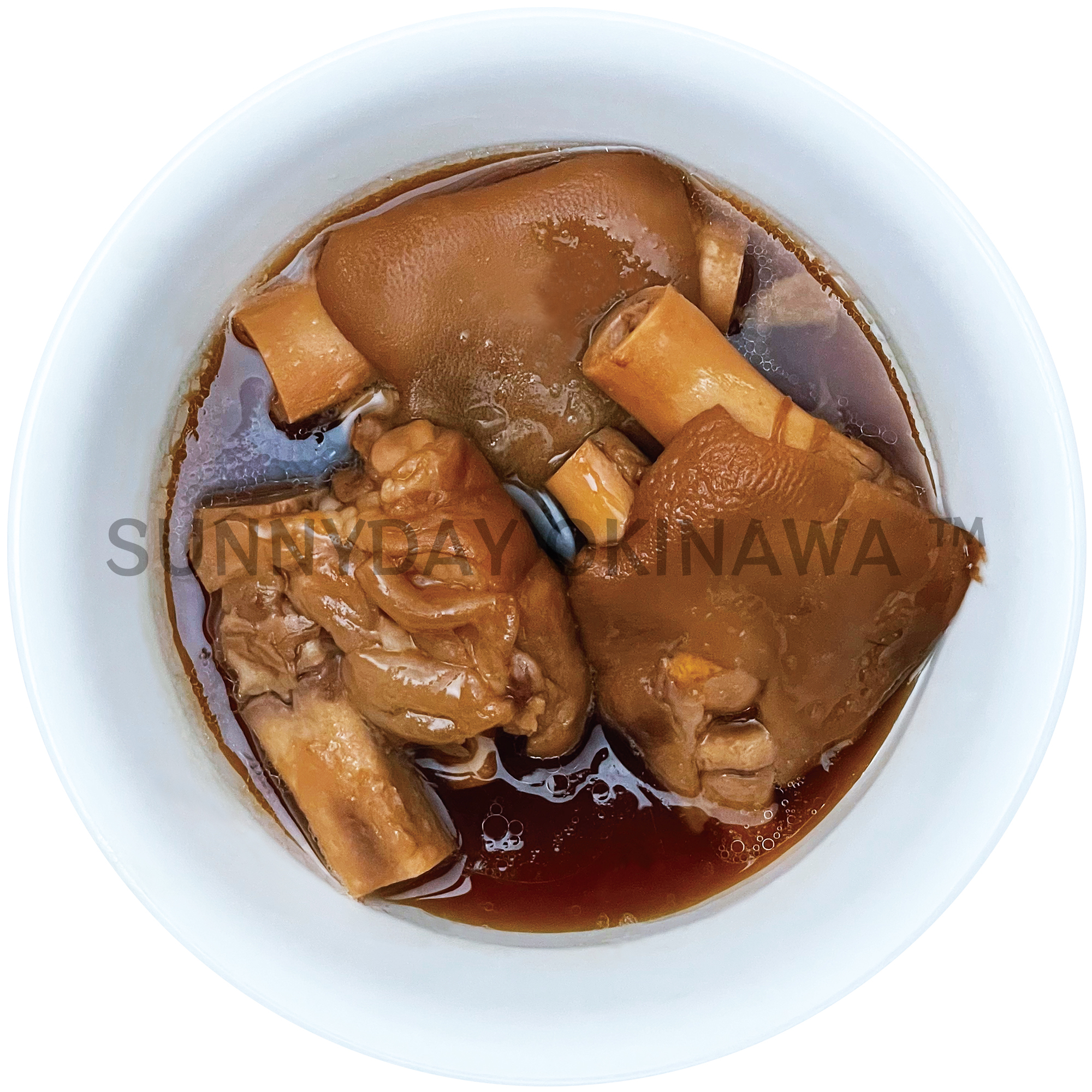 豚足(国産)、糖類(黒糖(沖縄県産)、砂糖)、しょう油、たん白加水分解物、泡盛、食塩、おろしにんにく/調味料(アミノ酸)、(一部に小麦・大豆・豚肉・ゼラチンを含む)