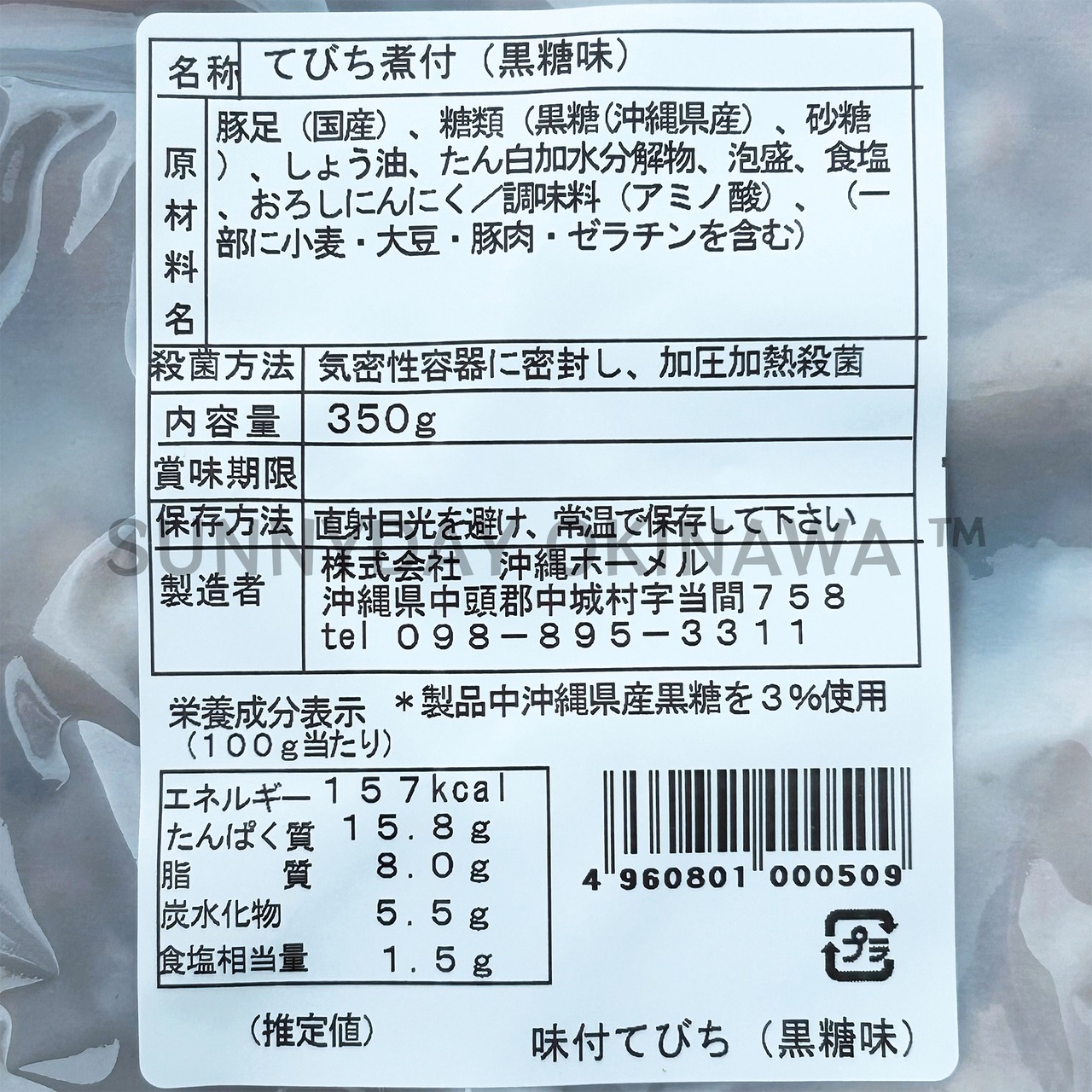 豚足(国産)、糖類(黒糖(沖縄県産)、砂糖)、しょう油、たん白加水分解物、泡盛、食塩、おろしにんにく/調味料(アミノ酸)、(一部に小麦・大豆・豚肉・ゼラチンを含む)