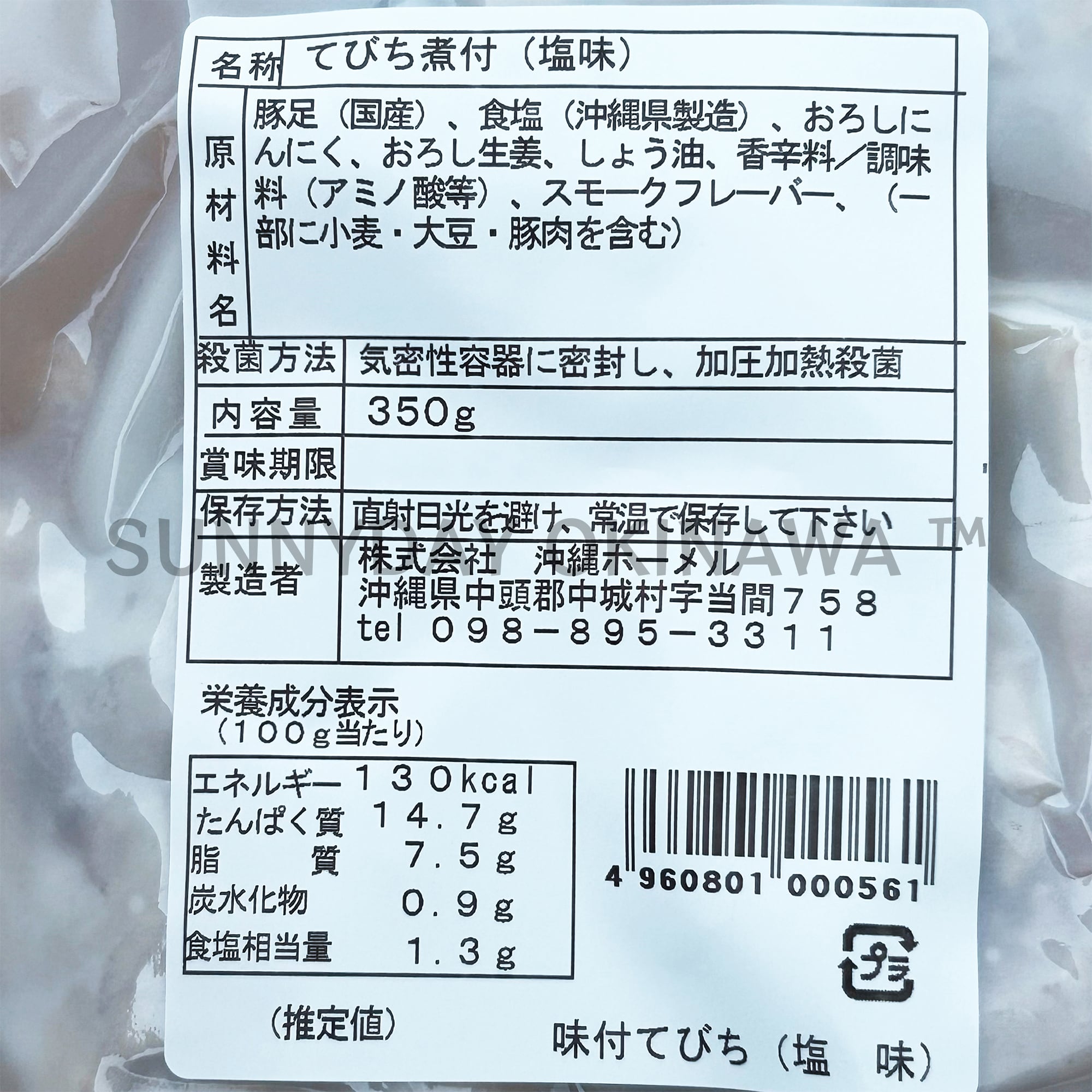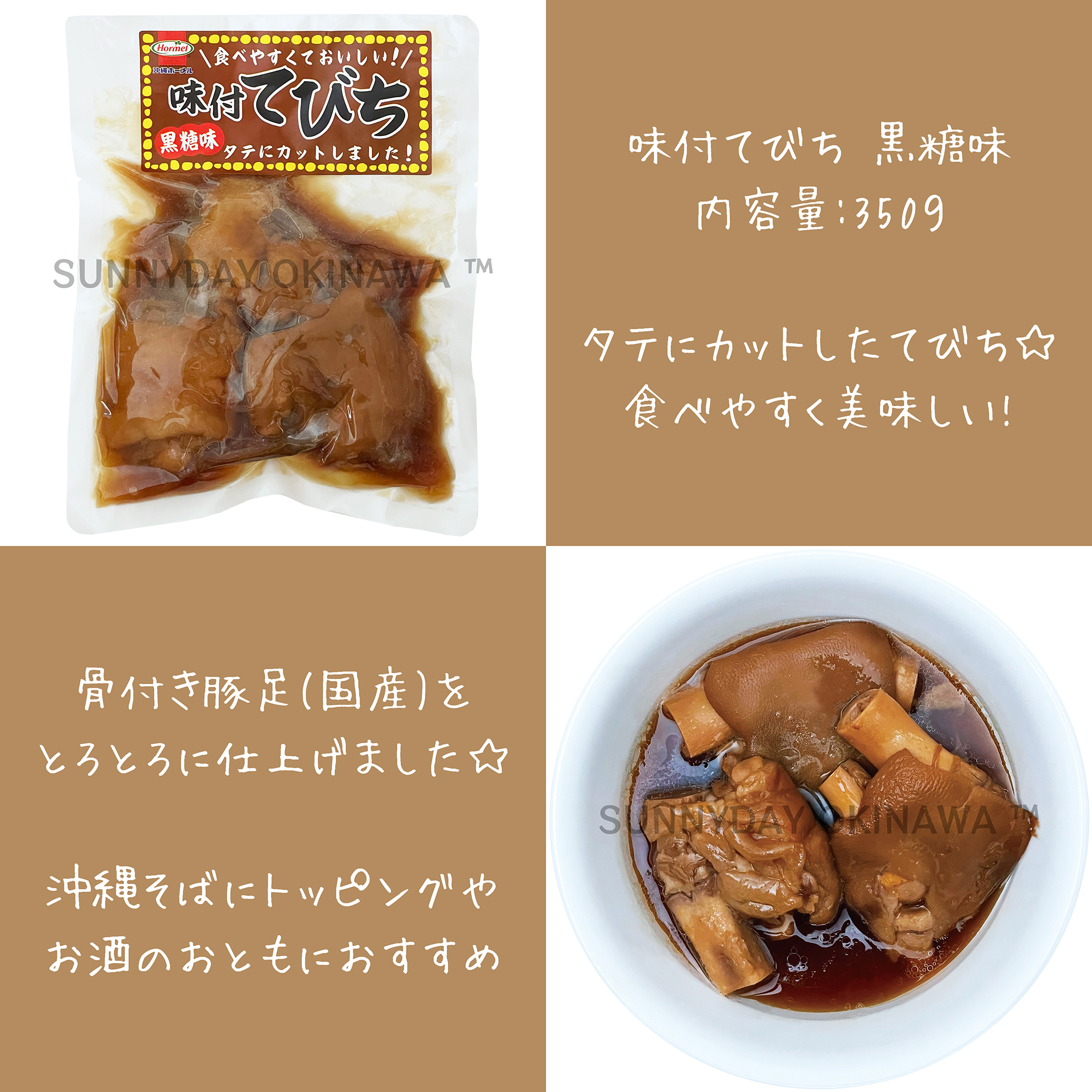 豚足(国産)、糖類(黒糖(沖縄県産)、砂糖)、しょう油、たん白加水分解物、泡盛、食塩、おろしにんにく/調味料(アミノ酸)、(一部に小麦・大豆・豚肉・ゼラチンを含む)