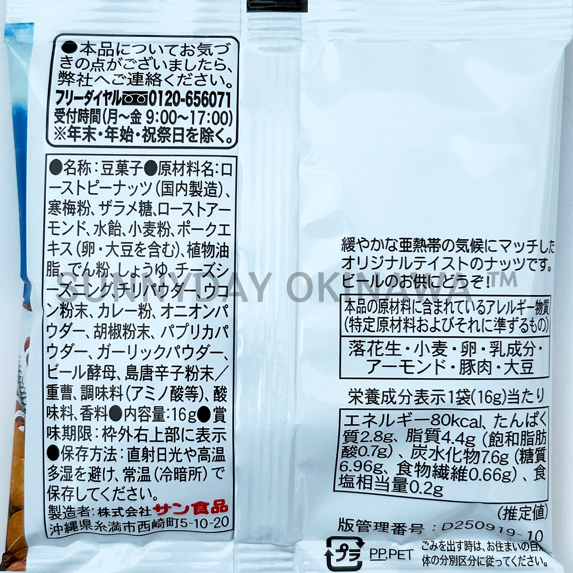 ローストピーナッツ(国内製造)、寒梅粉、ザラメ糖、ローストアーモンド、水飴、小麦粉、ポークエキス(卵・大豆を含む)、植物油脂、でん粉、しょうゆ、チーズシーズニング、チリパウダー、ウコン粉末、カレー粉、オニオンパウダー、胡椒、パプリカパウダー、ガーリックパウダー、ビール酵母、島唐辛子粉末/重曹、調味料(アミノ酸等)、酸味料、香料