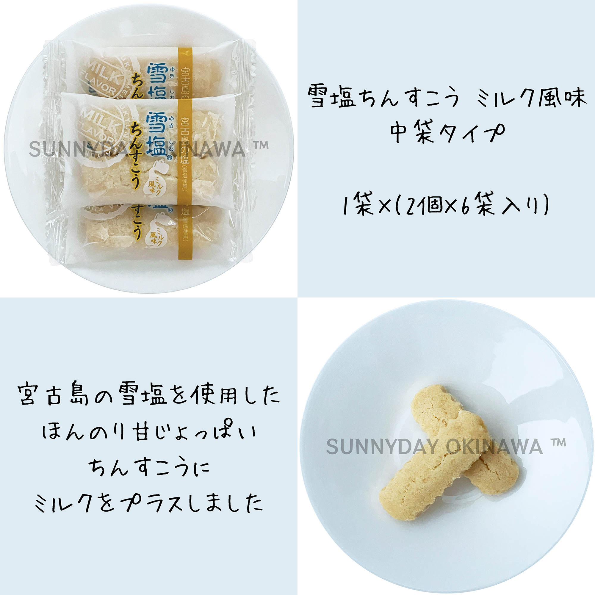 沖縄県・宮古島のブランド塩「雪塩」を使用したほんのり甘じょっぱいちんすこうにミルクをプラスしました。