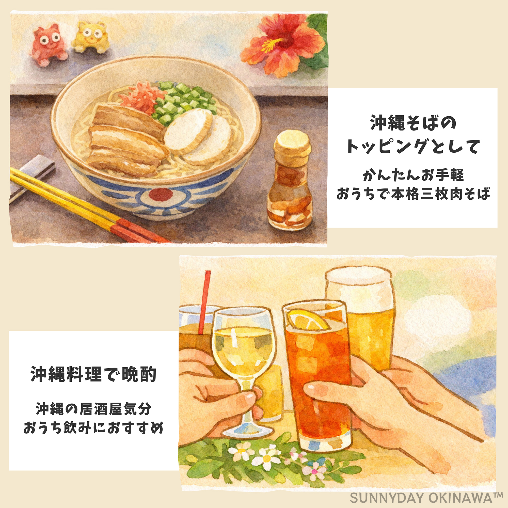 ご飯にのせてらふてぃ丼・沖縄そばのトッピング・お酒のおともにおすすめ☆