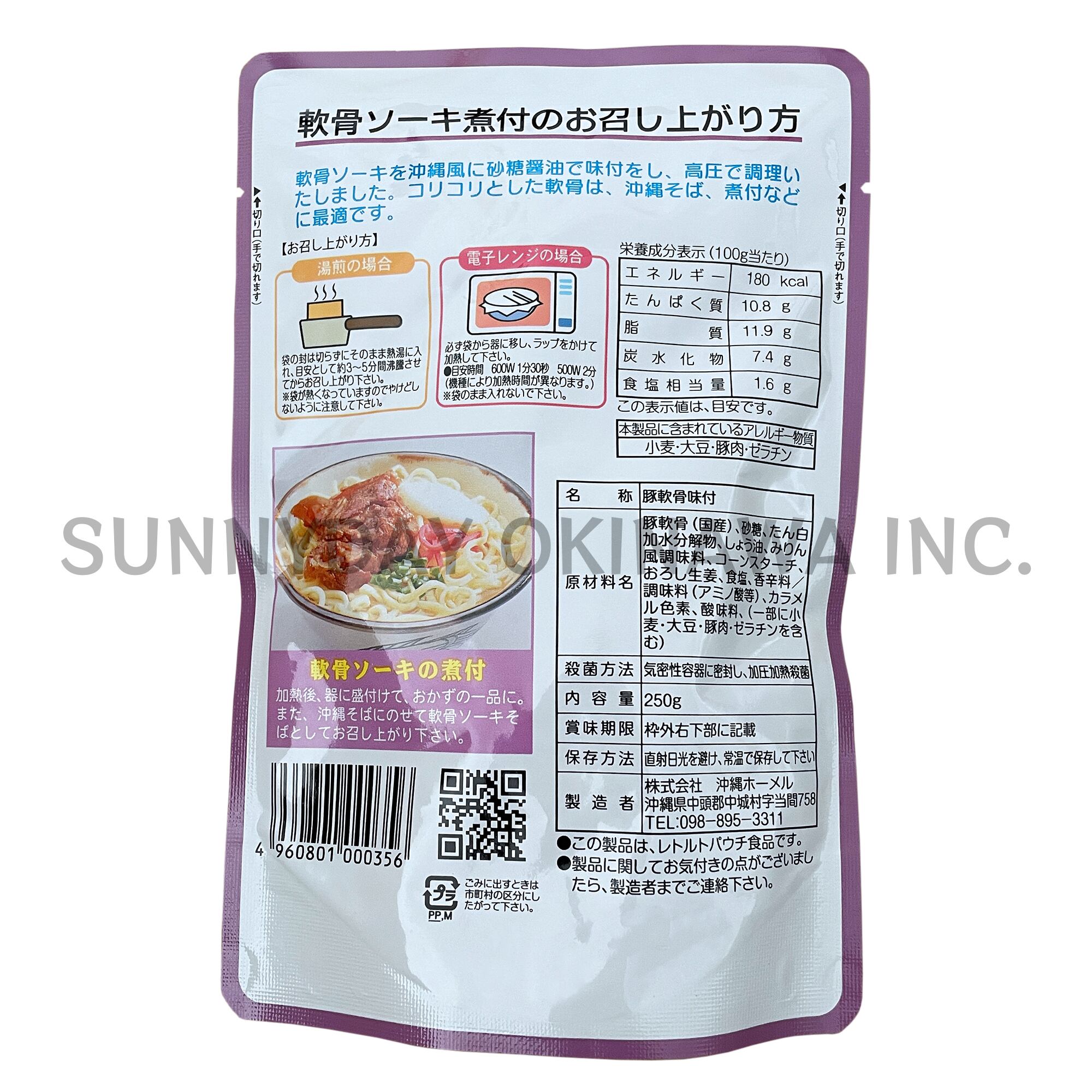 豚軟骨(国産)、調味液(たん白加水分解物、食塩)、砂糖、しょう油、みりん風調味料、コーンスターチ、おろし生姜、香辛料/調味料(アミノ酸等)、カラメル色素、酸味料、(一部に小麦・豚肉・大豆・ゼラチンを含む)