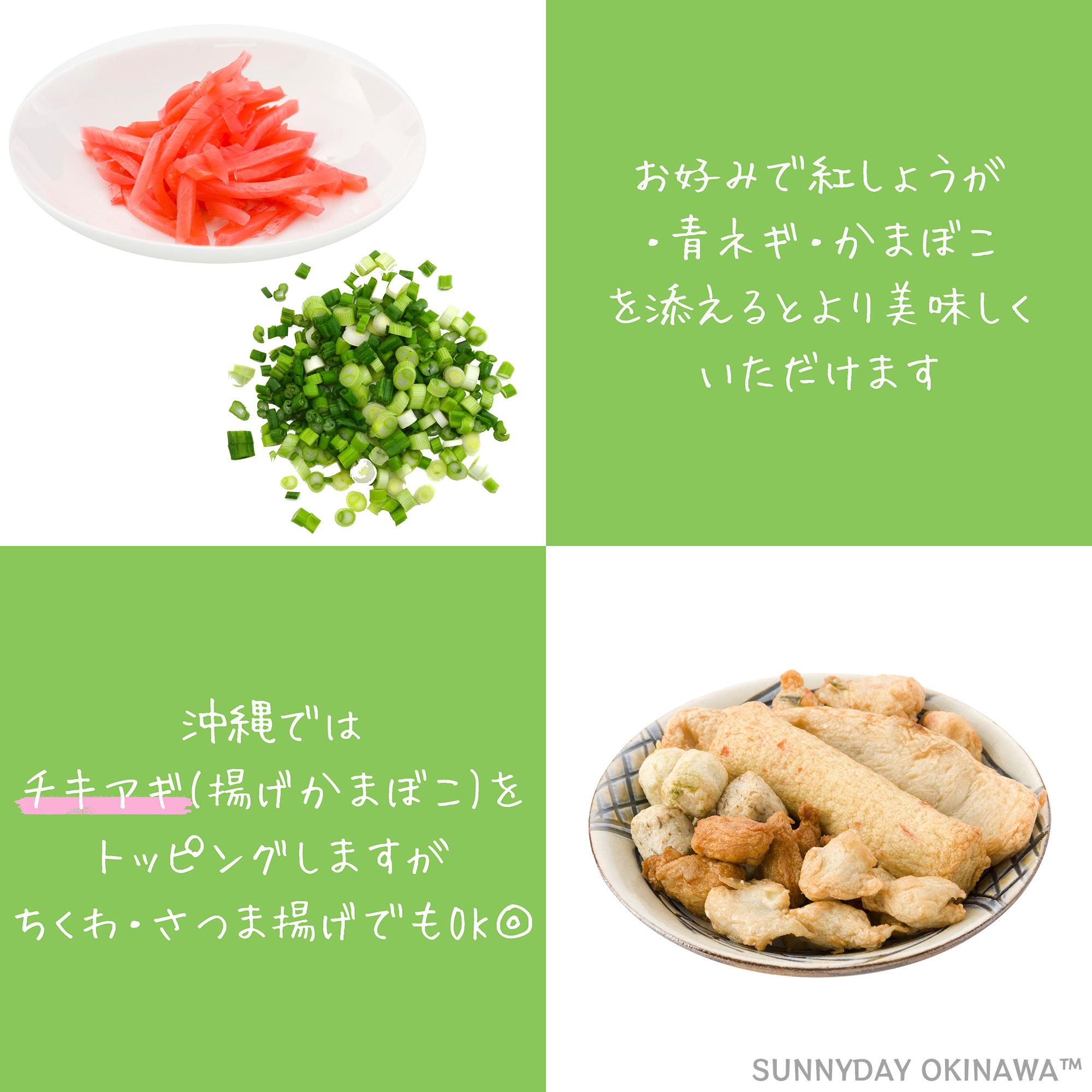 お好みで紅しょうが・青ネギ・かまぼこを添えるのもおすすめです。